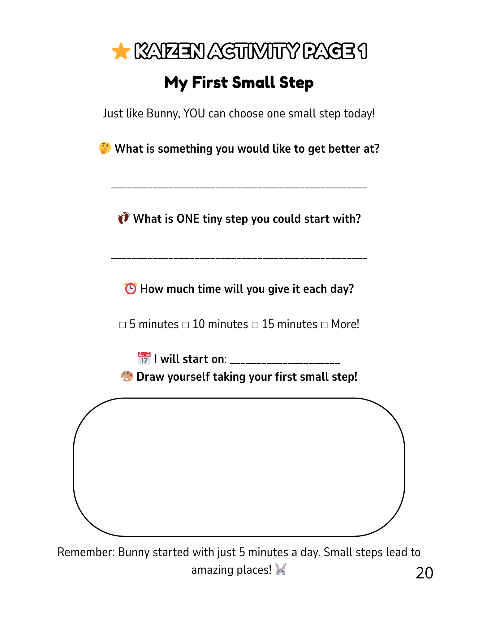 ⭐ 5 Kaizen Activity Pages After every block of chapters, your child stops and connects the story to their own life. What do I want to get better at? What is my ONE tiny step today? How much time will I give it?