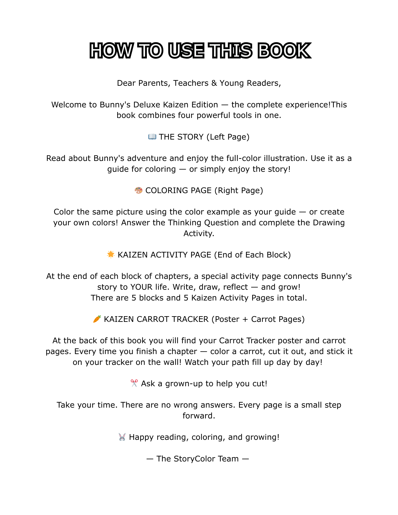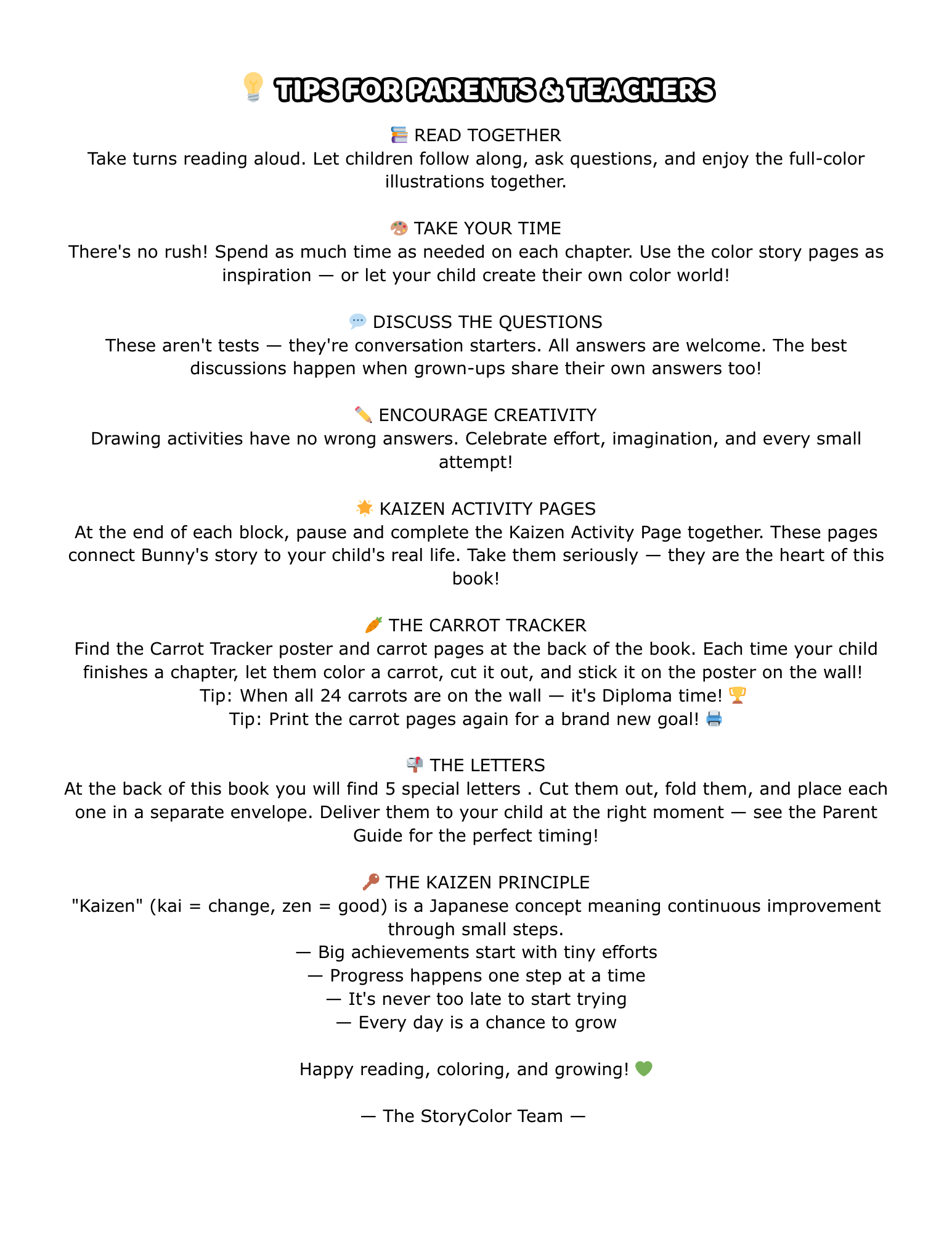 📘 Parent & Teacher Guide Everything you need to make Bunny’s journey unforgettable. When to deliver each letter. How to use the Carrot Tracker. Conversation starters after each chapter. How to bring Kaizen into your daily family routine.