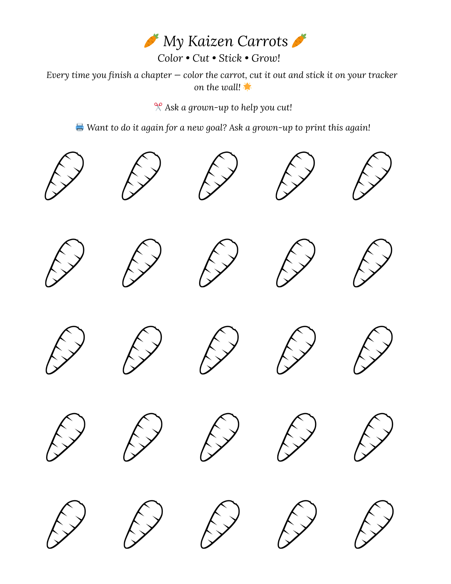 Q: Can we do the Carrot Tracker again for a new goal? A: Yes! Simply reprint the carrot pages and choose a brand new goal. The tracker works for any habit — reading, tidying, practicing an instrument, or anything your child wants to improve.