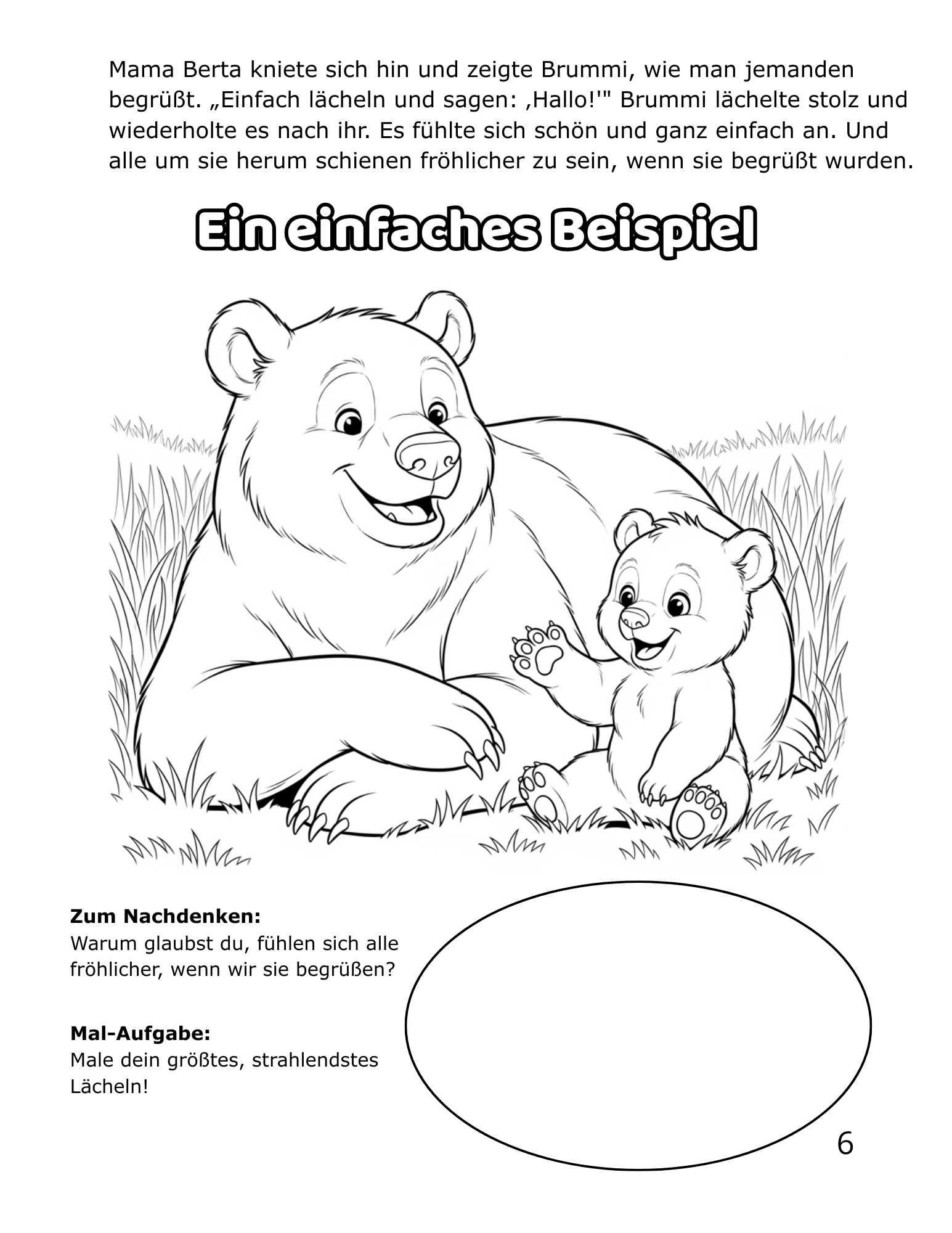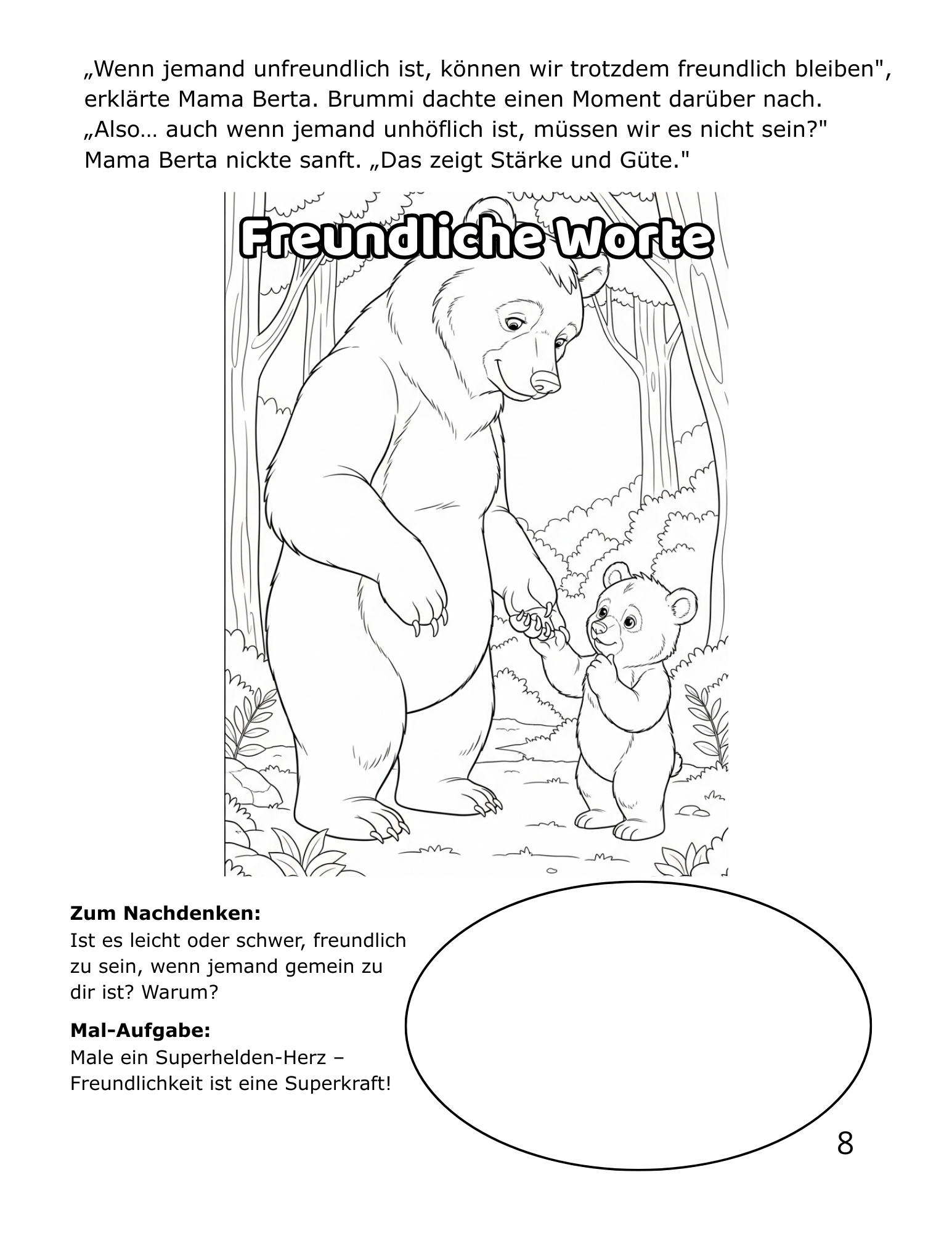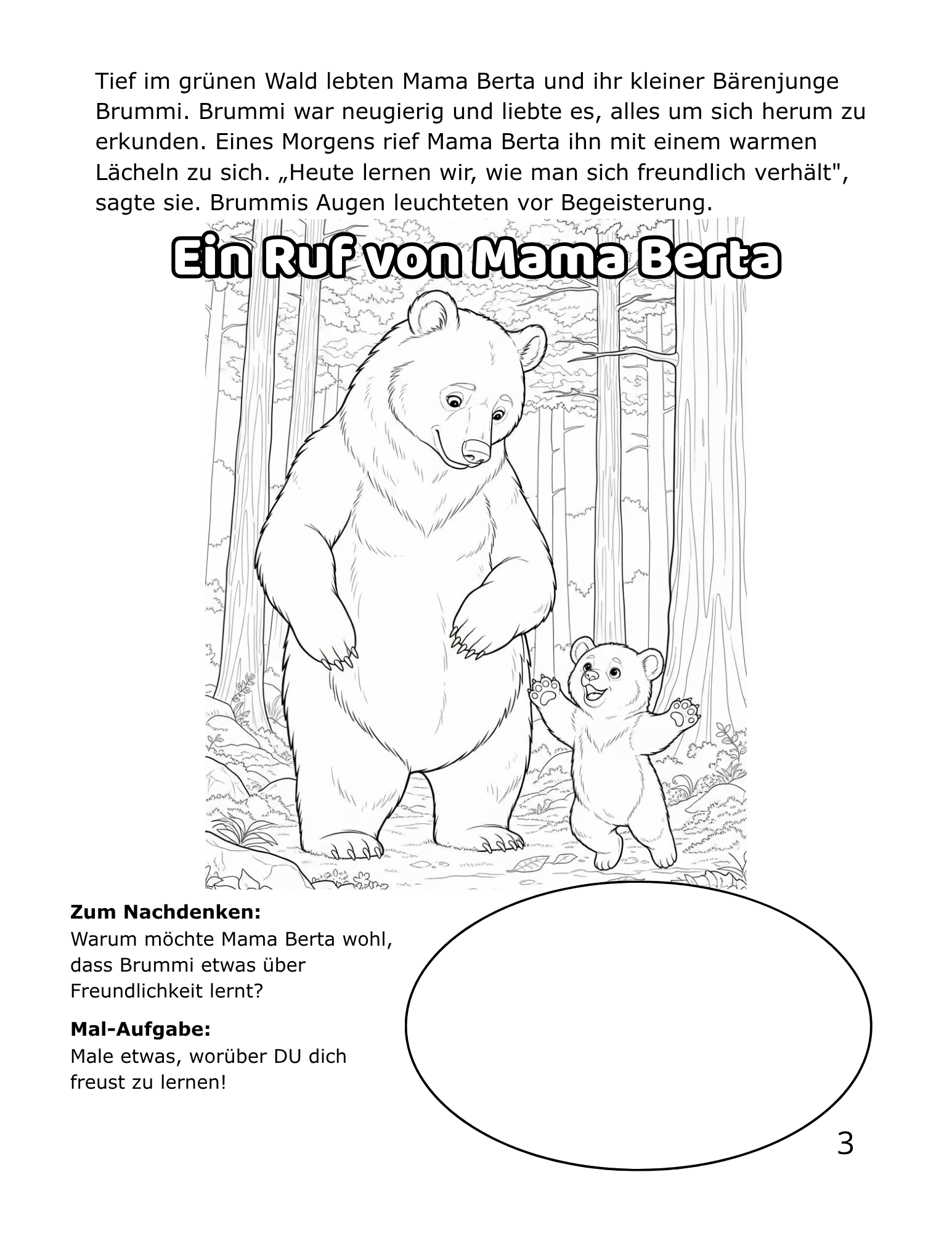 Brummi ist ein neugieriger kleiner Bär, der gemeinsam mit seiner liebevollen Mama Berta lernt, wie wichtig Freundlichkeit im Alltag ist. Unterwegs treffen sie Hopsi den Hasen, Nussi das Eichhörnchen und viele andere Waldfreunde – und entdecken gemeinsam, dass kleine freundliche Taten die ganze Welt verändern können.